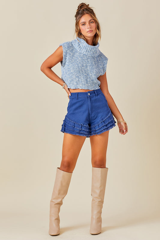 Mulit-tiered Raw Edge Denim Shorts - Navy