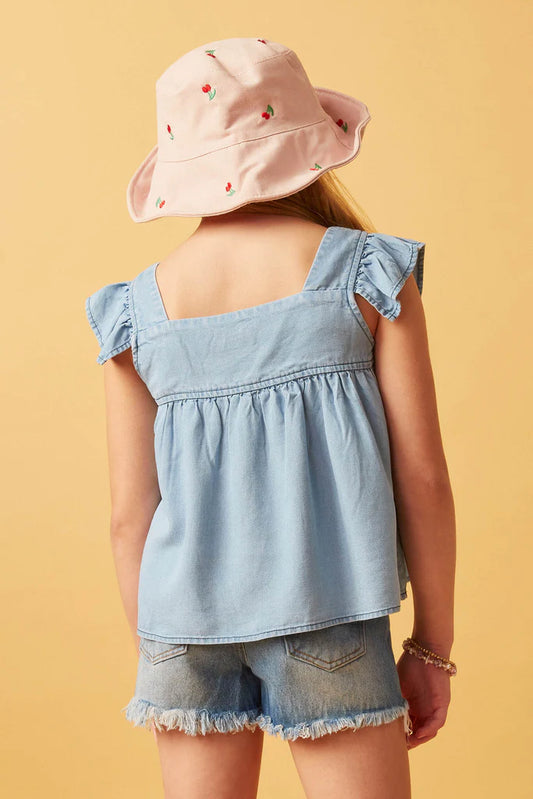 Girls Tencel Square Neck Ruffle Cap Sleeve Top