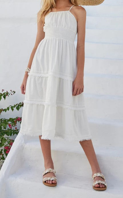 This white cotton linen fabric and the frayed detailed dress has a form-fitting smocked bodice with a flowing skirt.