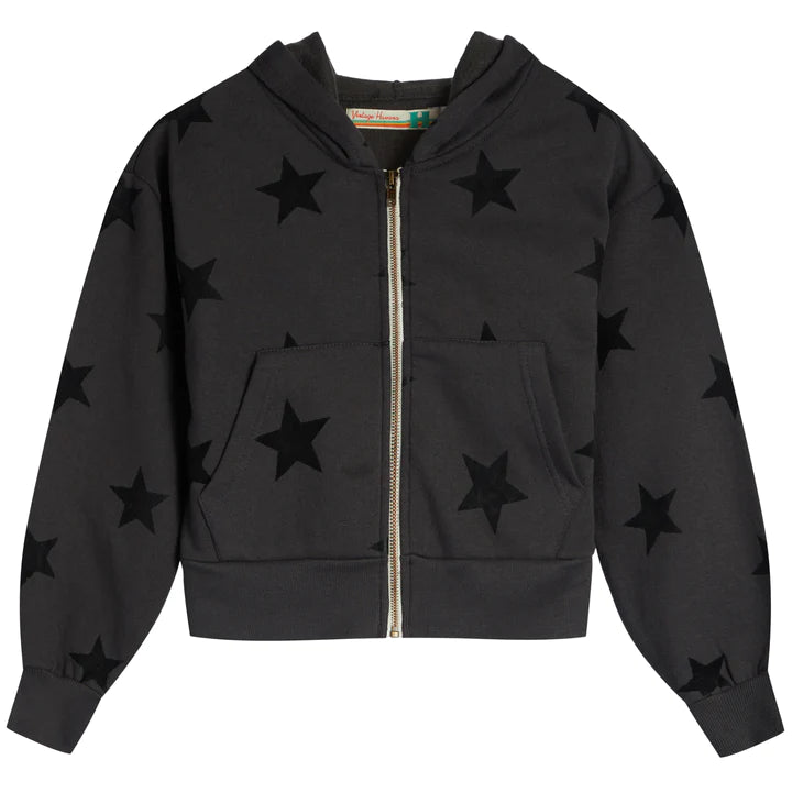 Stay cozy and stylish with this Black Flocked Allover Star Cropped Zip Hoodie! This snazzy hoodie features a black-flocked allover star pattern that adds a fun, quirky touch. The cropped zip design will have you looking great while keeping you warm. Star-studded style for the win!