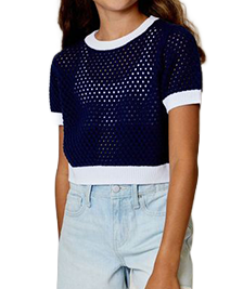 Stay cool and stylish with our Girls Navy and White Short Sleeve Top. Made with breathable fabric, this top is perfect for any season. Pair it with jeans for a casual look.