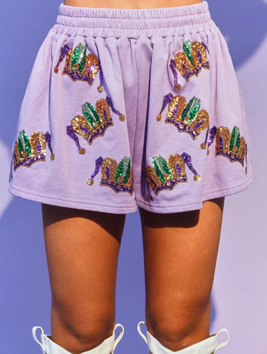 Spice up your outfit with our Mardi Gras Sequin Jester Shorts! The vibrant purple knit and regal jester crown sequin details are sure to make a statement. Ideal for all your Mardi Gras festivities or any occasion that demands a little bit of silly fun.