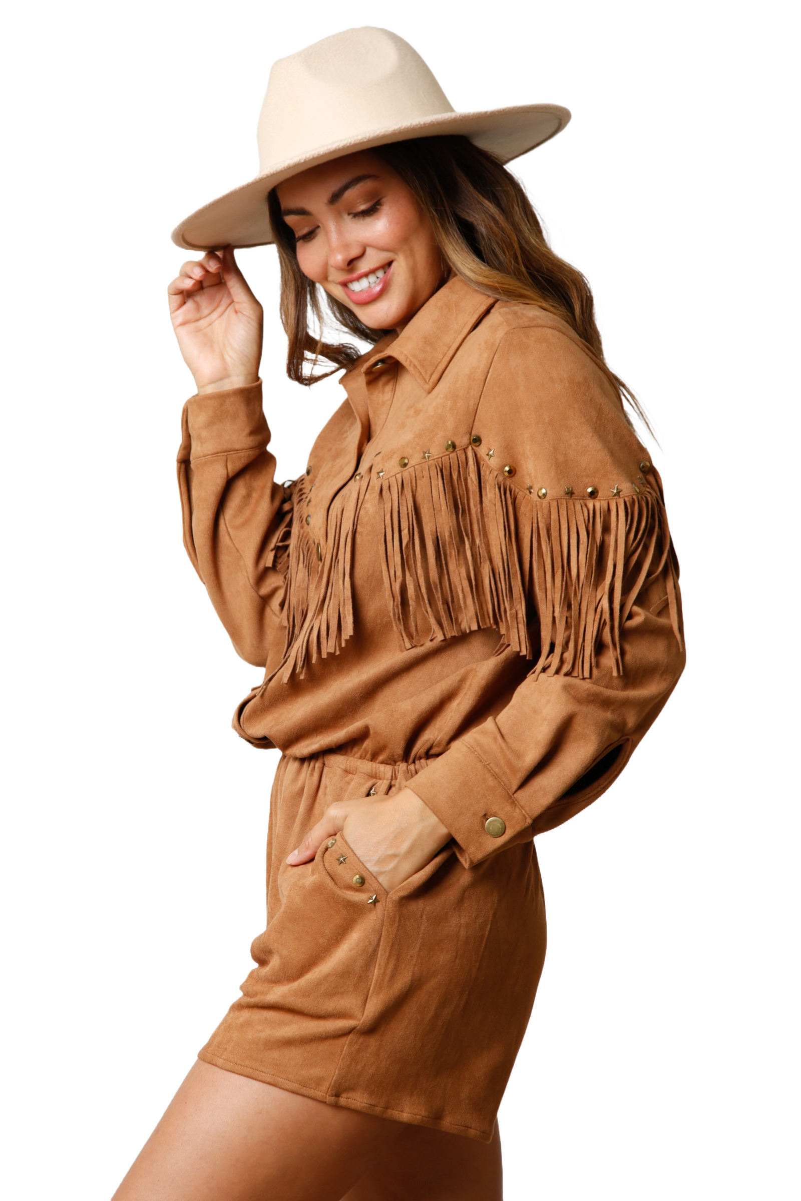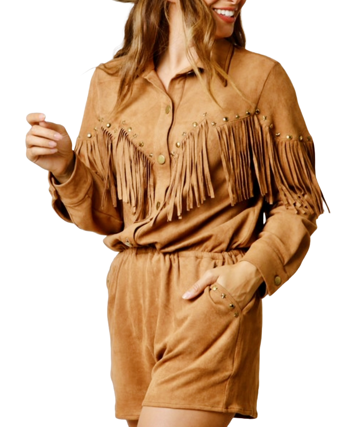 Get ready to rock in this trendy Suede Romper! Made with soft, luxurious suede and adorned with fringe and studs, this romper is the perfect mix of edgy and chic. A must-have for any fashion-forward individual looking to make a statement. (Look cool without even trying!)